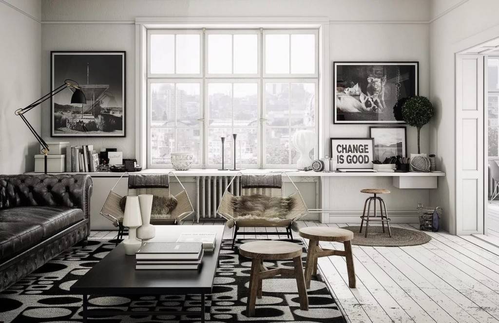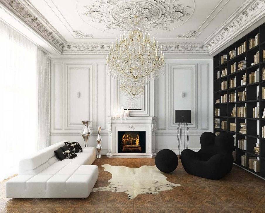 Грамотное использование двух цветов может оказать совершенно полярный результат на конечный интерьер: комната может выглядеть вызывающе и нестандартно или, напротив, уютно и спокойно. Часто предубеждение заставляет людей избегать этого цветового решения ввиду его, якобы, «офисности и безынтересности». Однако фото черно-белого интерьера гостиной в дизайнерском каталоге многих заставляет изменить точку зрения.