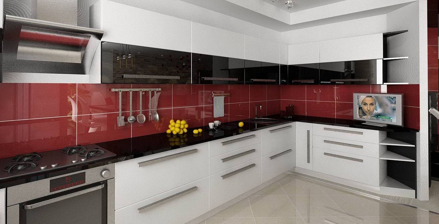 Наиболее интересное оформление получается, если использовать третий колер, в качестве яркого контраста. На белой кухне с практически полностью черной техникой, дополнительным колером станет красный – это отдельные линии на фасадах, посуда, текстиль.