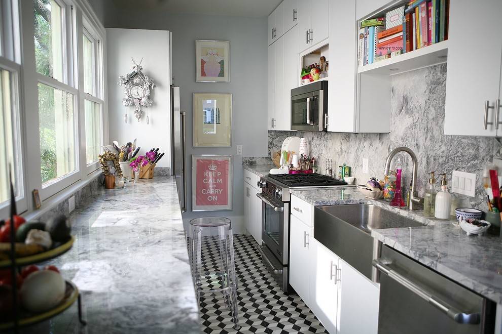 Черная столешница на белоснежной кухне. Белый цвет зрительно увеличивает даже самое маленькое пространство.