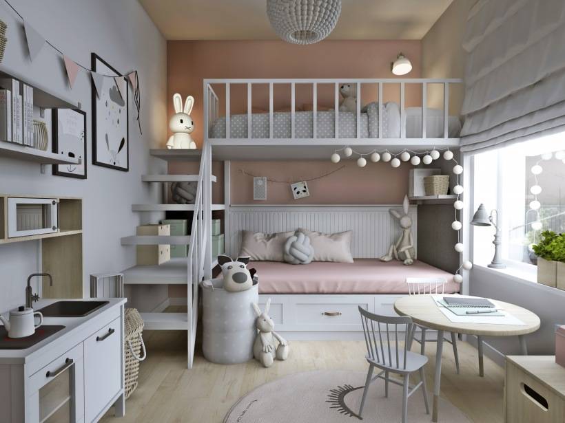 Если у вас не один ребенок, а комната маленькая, то проблему с размещением кровати можно решить несколькими способами: