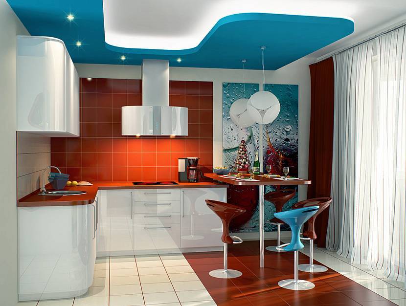 Потолок на кухне в морском стиле должен быть нейтрального цвета – белого, бледно-голубого или песочного. Насыщенные тона сделают пространство визуально более узким, чем оно есть на самом деле. Это особенно противопоказано кухням маленького размера. Подчеркнуть общую тенденцию дизайна кухни можно с помощью деревянных балок, расположенных под потолком. Если позволяет площадь кухни, можно соорудить многоуровневый потолок со встроенными источниками света.