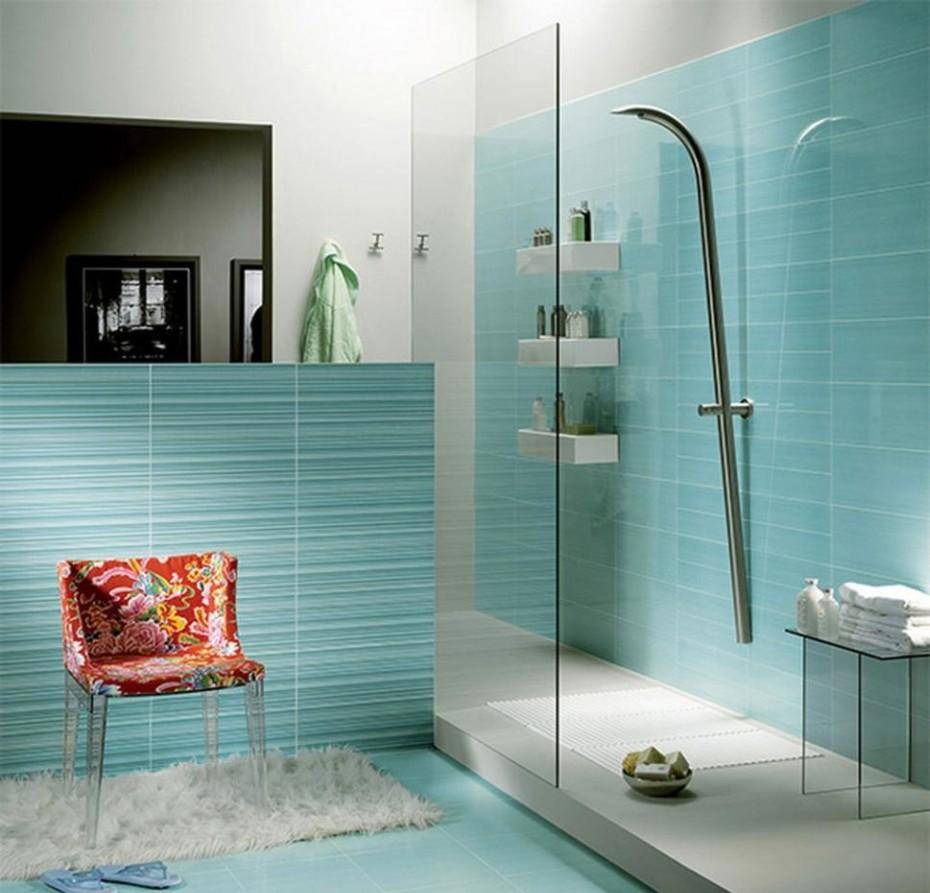 Для ванной комнаты применяют кафель бирюзового оттенка. Он прекрасно сочетается с белым, иными светлыми тонами. Стильно будет выглядеть бирюзовый пол в дуэте с белыми стенами, которые украшены панно с сине-зелеными изображениями. Точный оттенок тоже должен зависеть от габаритов помещения и по возможности быть светлее.