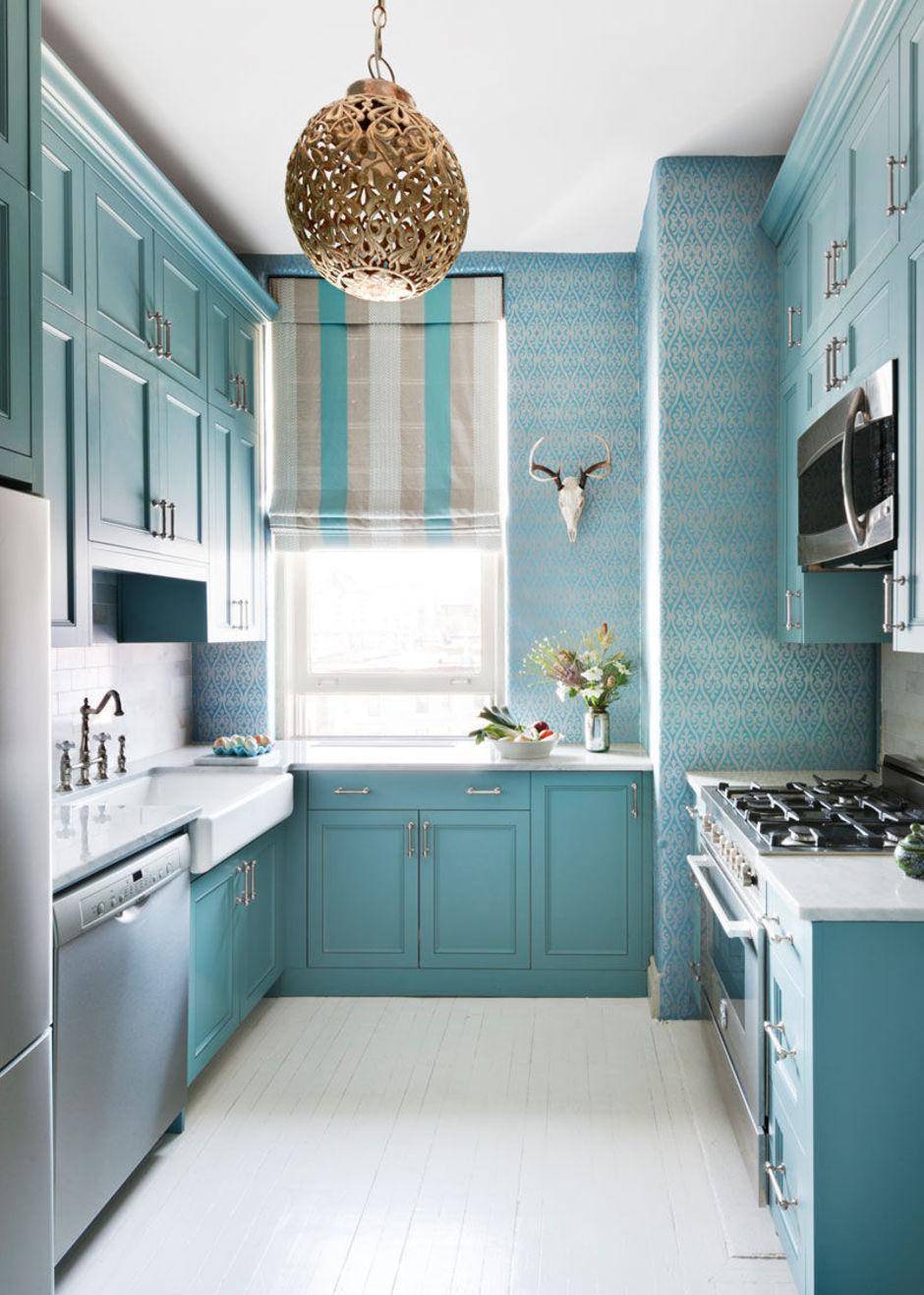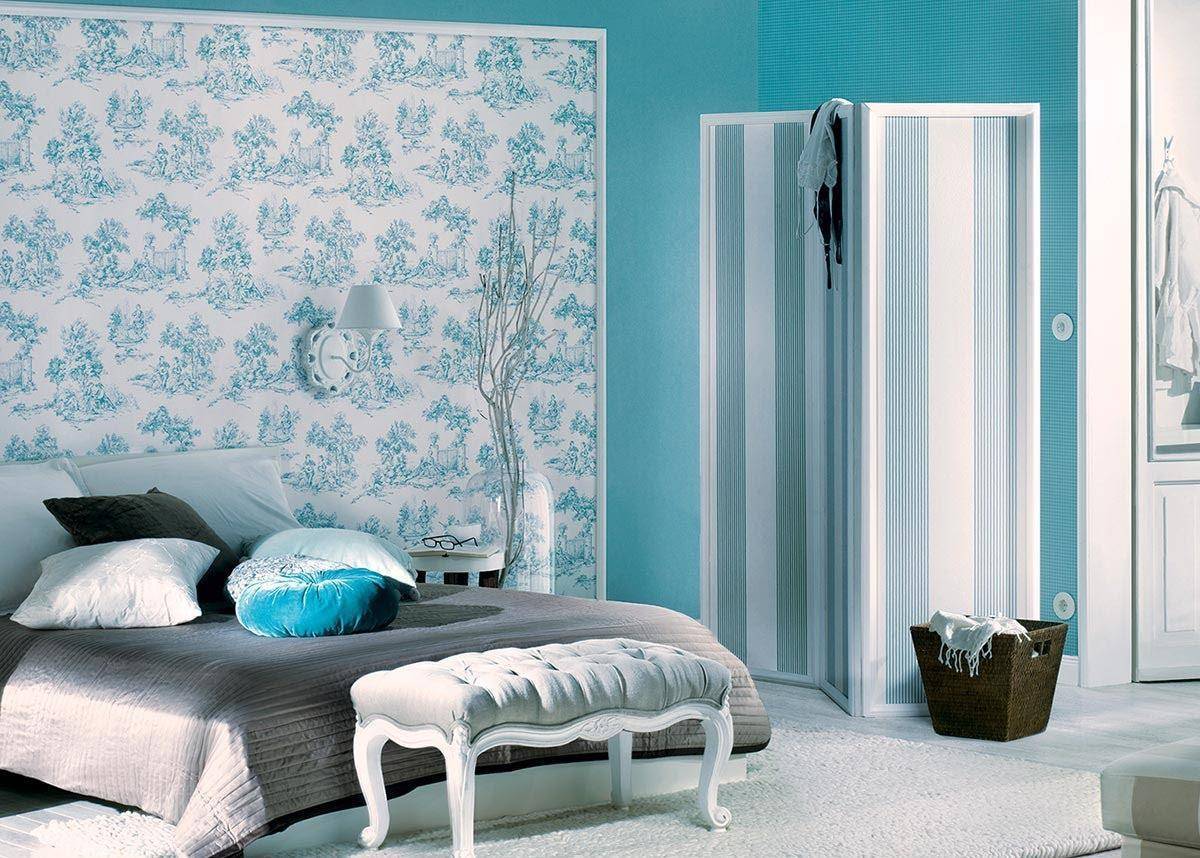 Проще всего оклеить стены обоями цвета бирюзы. Вообще, материал покрытия может быть любым, нередко используется краска, хотя по удобству она проигрывает обоям. Несмотря на возможность колеровки в абсолютно любой цвет, краска не скроет дефекты стен, к тому же, на нее довольно сложно будет нанести рисунок, орнамент.
