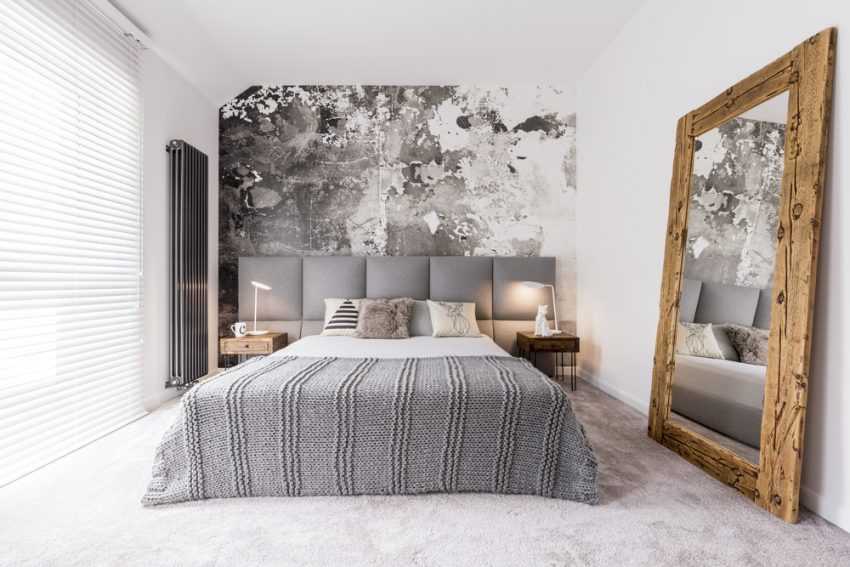 - Довольно популярны и серые обои в интерьере спальни. Они могут быть разных тонов от светлых до темных и совсем не ассоциируются с серостью и мрачностью жизни. В скандинавском стиле могут сочетаться сразу несколько оттенков, что помогает абстрагироваться от внешнего мира.