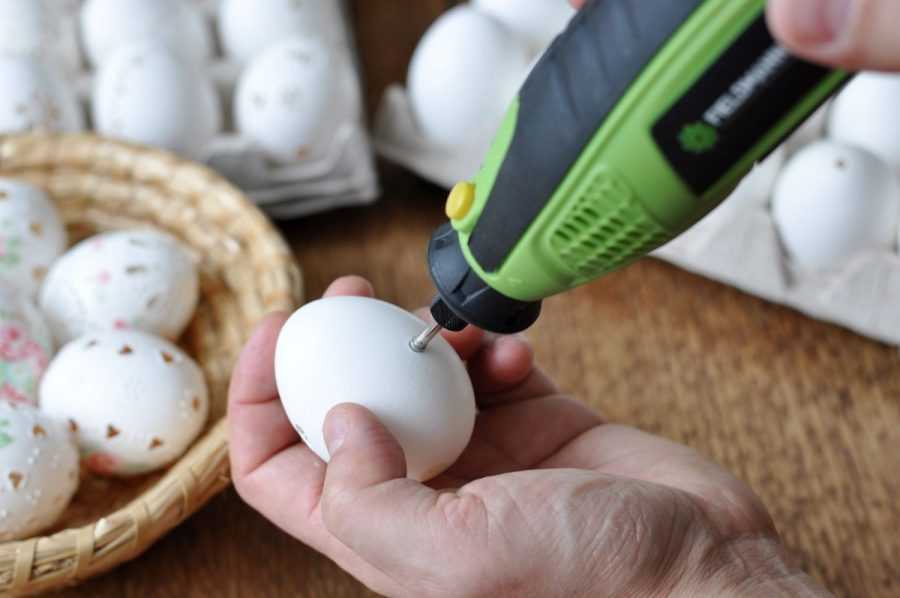 На подготовленную скорлупу наносится рисунок, а затем делают отверстия в нужных местах. Необходимо четко представлять, где будет входить, выходить игла для получения определенного фрагмента рисунка.