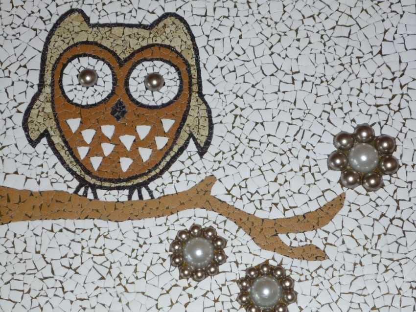 Битые скорлупки используют в качестве мозаики. Сделать красивое панно можно самостоятельно. Основу необходимо предварительно обезжирить и окрасить.
