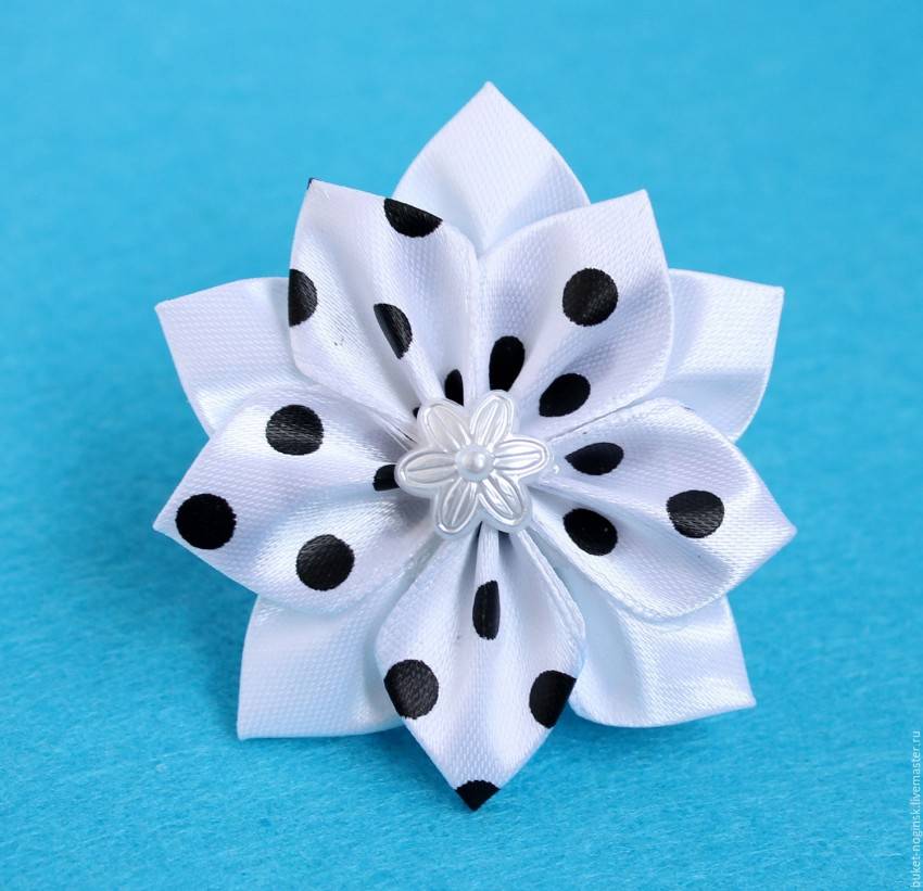 По середине бутоньерки капните клей и при помощи ваты размажьте его по цветочным полостям. На завершающем этапе, можно добавить дополнительный декор в виде листвы, страз, бусинок. Так же для такой бутоньерки, вам нужно сделать основу в форме круга, используя для этого, например, пластик. Такая заготовка обтягивается тканью из атласных материалов в тон изделия. Поверх такой основы и осуществляется крепление подготовленной бутоньерки, сделанной своими руками в стиле канзаши. Осталось только закрепить данный аксессуар на поверхности одежды или сумки и любоваться проделанной работой.