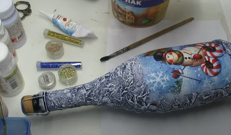 - Украшаем бутылку блестками. Для этого используем клей или акриловый лак.