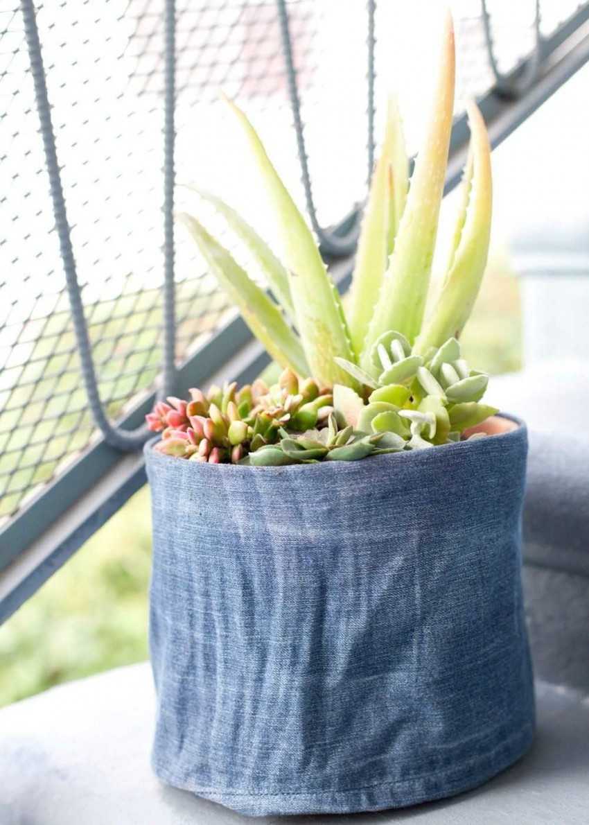 - Сшить из грубой ткани чехольчик или просто обтянуть вазон мешковиной. Дополнительно ткань можно украсить пуговицами или бусинами. Весьма изысканно смотрится кружевной вариант декорации для горшка.