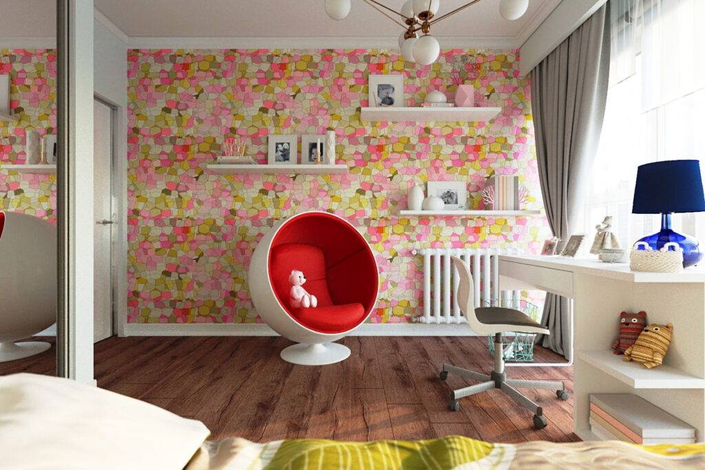 Яркая стенка из цветочных обоев в сочетании с креслом вамп оригинальной формы и красного цвета придаст соответствующего настроя в учебных подвигах и начинаниях.