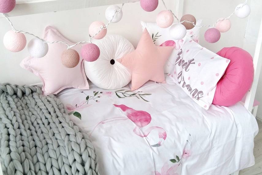 В современных стилях, в частности скандинавском, пользуется популярностью дополнение детской спальни светящимися шариками в виде гирлянды. Ее можно использовать в качестве ночника для мягкого освещения. При дневном свете гирлянда оригинально дополнит интерьер.
