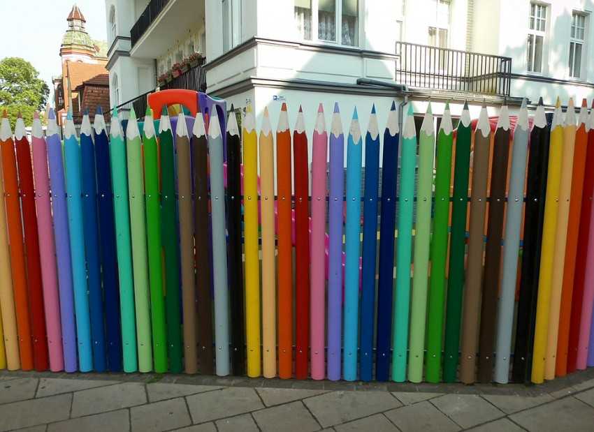 Предлагаем еще один вариант оформления забора. «Освежить» старый забор поможет обычная яркая краска. Забор можно будет разукрасить вместе с детьми. Яркие рисунки также приветствуются.