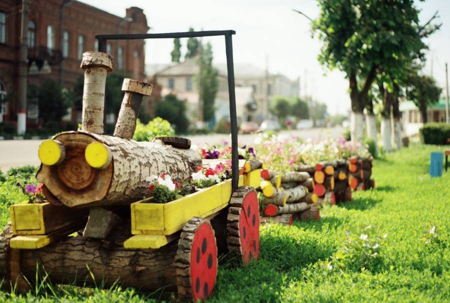 Телега из дерева станет очень аутентичным украшением в сельской местности, если вы оформили свой участок, скажем, в кантри стиле. Кроме того, отличной идеей станет вазон для цветов, вы сможете выращивать растения прямо внутри этого элемента садового декора.