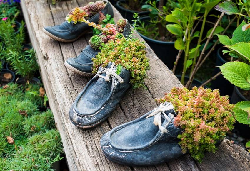 Старая обувь еще может послужить в качестве цветочных горшков и украсить участок