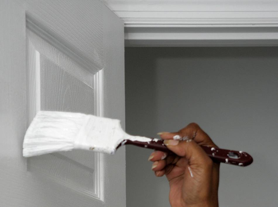 Белая, просто окрашенная дверь. Обновить её или перекрасить в другой цвет не составит большого труда, хотя молдинги и резьба нуждаются в особом, бережном обращении во время шлифовки и снятия слоя старой краски