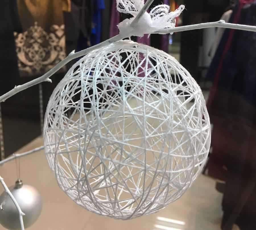 Собственно, все. Получился тонкий и легкий, словно нежная паутинка, шарик. Когда держишь его в руках, он кажется невесомым и хрупким. Так и есть – игрушку нужно беречь, не ронять, не сминать, не класть сверху ничего тяжелого. Поверхность шарика можно декорировать бисером, блестками, пайетками, покрыть аэрозольной краской.