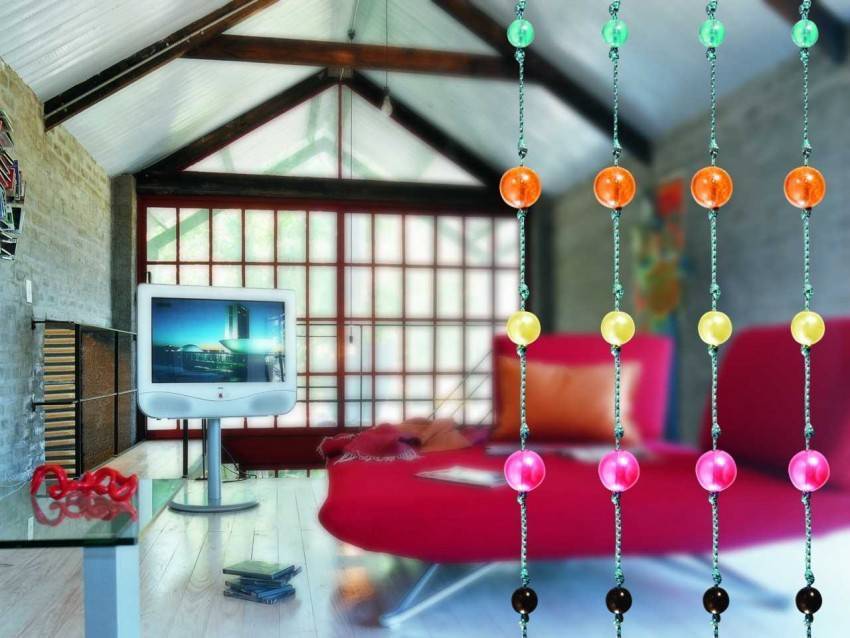 На пол можно положить пушистый коврик из помпонов. Для его изготовления понадобится строительная сетка и множество помпонов, сделанных из остатков шерсти. Коврик может быть однотонный или разноцветный, а опытные мастерицы создают даже небольшие картинки и узоры из мягких комочков.