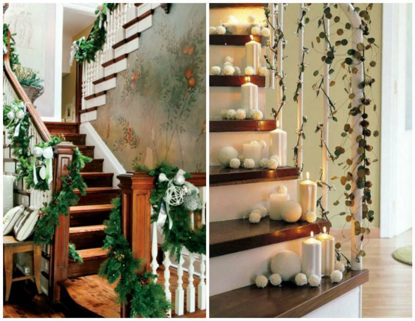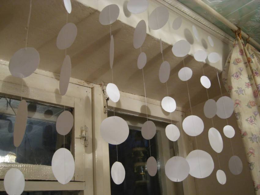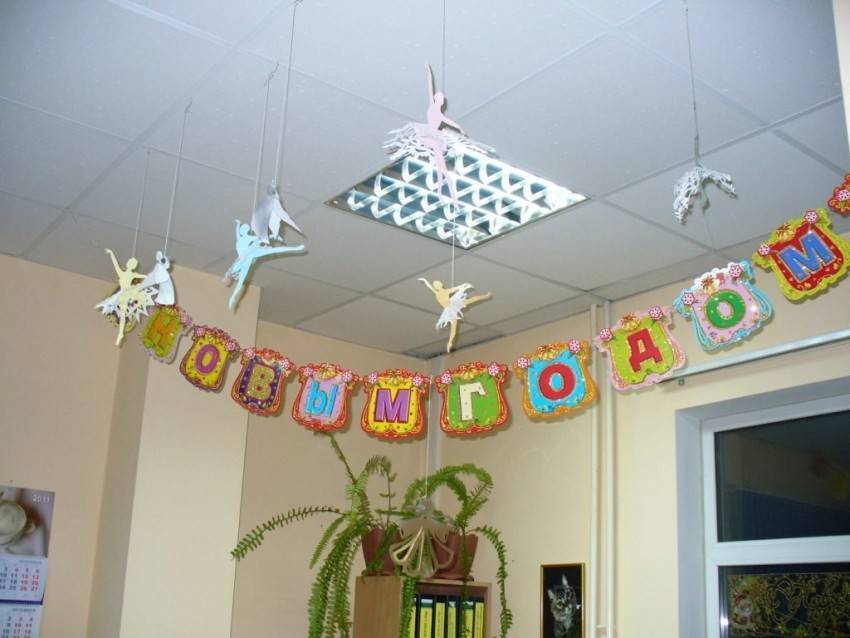 Поделки для Нового дома представляют собой рождественские венки из картона, мишуры, мягких веток, украшенные новогодними шарами и конфетами, новогодние носки для сладостей от Санта Клауса из ткани, гирлянды из бумаги.