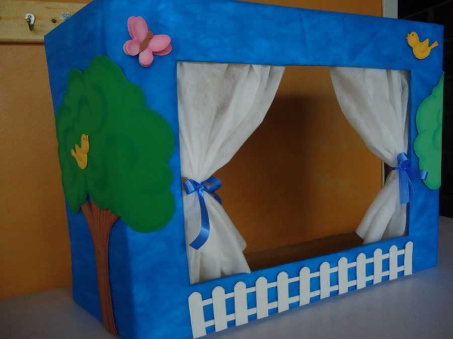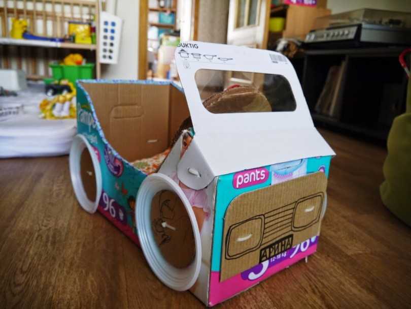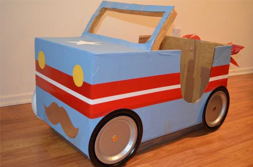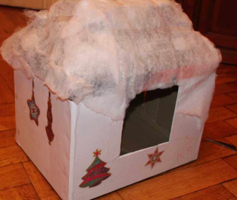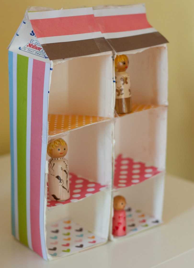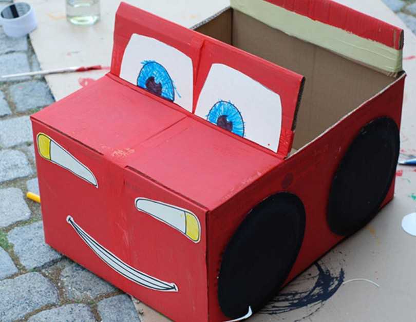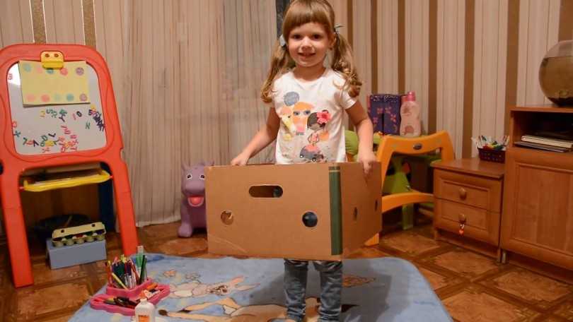 Эта поделка из картонной коробки потребует чуть больше усилий, чем предыдущее изделие. Нужно вырезать «окно», а наверху прорезать четыре отверстия. Ширина отверстий должна быть равна диаметру деревянных шпажек.
