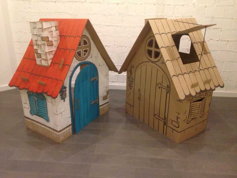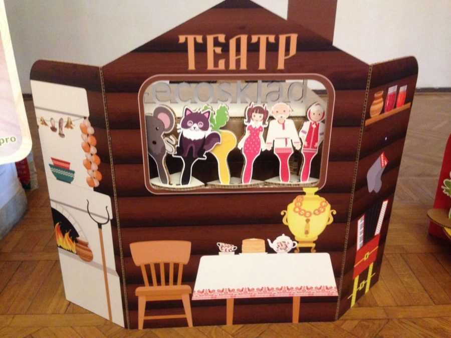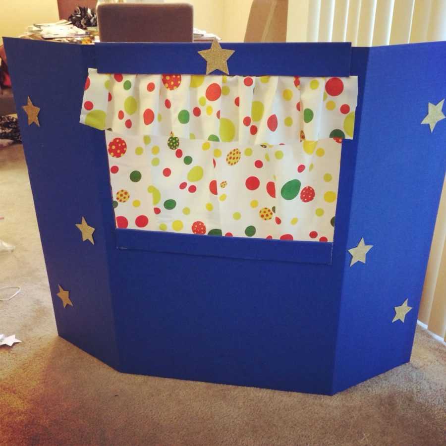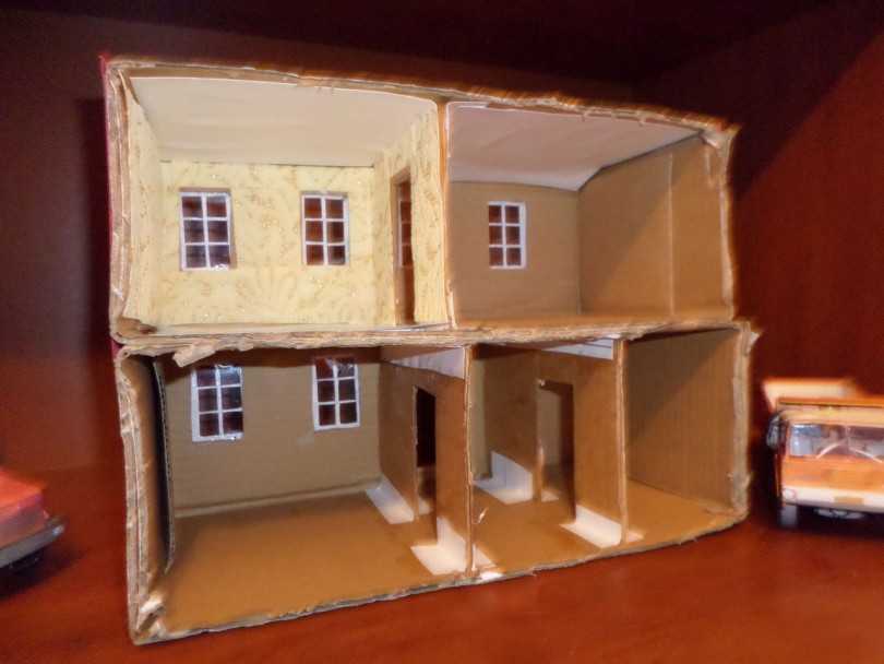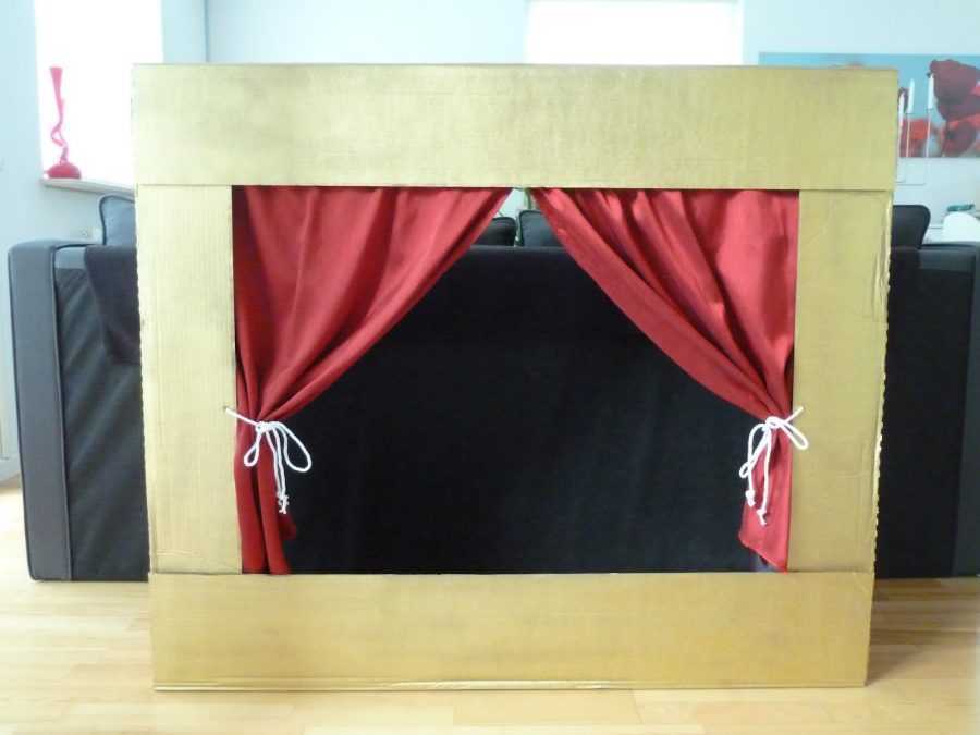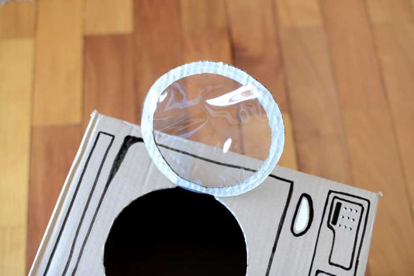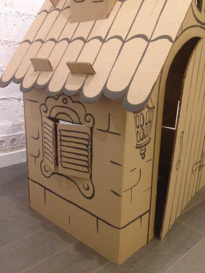 Эта поделка из картонной коробки потребует чуть больше усилий, чем предыдущее изделие. Нужно вырезать «окно», а наверху прорезать четыре отверстия. Ширина отверстий должна быть равна диаметру деревянных шпажек.