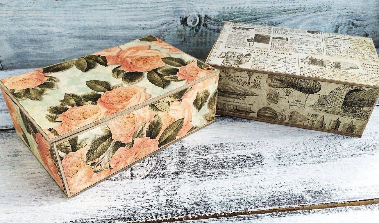 Для оформления картонных коробок в стиле декупаж необходимо: