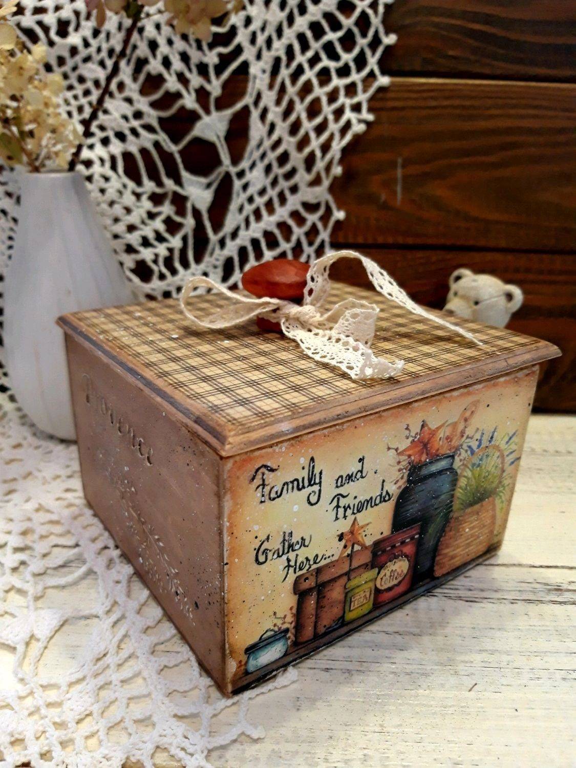 Для кухни отлично подойдут рисунки с фруктовыми и овощными натюрмортами, ароматными травами и т.д. Для хранения швейной гарнитуры используйте жестяные коробки с соответствующим рисунком (например, ткани, нити).