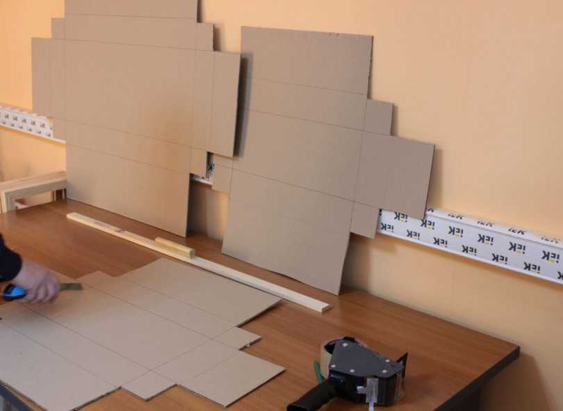 Из картона формата А3 необходимо выкроить площадку и приклеить ее ближе к нижней части. На ней делаются прорези, как и сверху. Чтобы она держалась, нужно подклеить снизу небольшие отрезки из картона, а затем на нее приклеить саму площадку.
