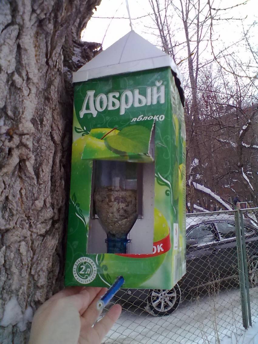 Самые обычные коробки из под сока подойдут нам в качестве крепких кормушек для птиц.