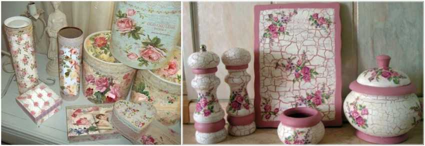 Чаще рукодельницы предпочитают деревенские мотивы для оформления, в особенности французский стиль прованс. Шкатулки и другие предметы быта украшают анютиными глазками, маками, розами, подсолнухами, сиренью, лютиками, тюльпанами или одуванчиками.