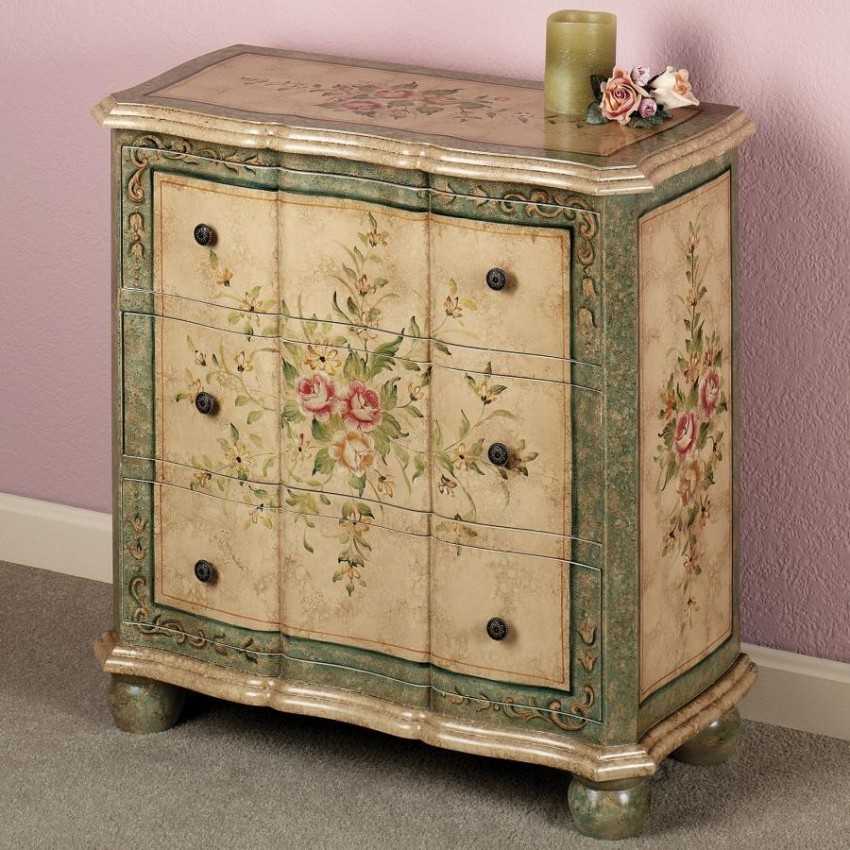 Для оформления в стиле прованс лучше выбрать мебель, где имеется много ящиков, завитков, резных элементов. Трещины после кракелюра нужно заполнить золотистой или серебристой краской, поверхность мебели после окрашивания основной краской и нанесения рисунков, промокнуть поочередно золотой, коричневой, черной красками.