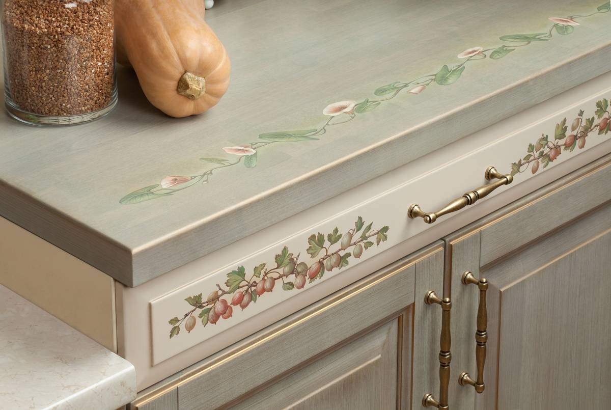 Для нанесения дополнительного рисунка на столешницу можно использовать заранее подготовленные трафареты или самую обычную тюль. Когда основной цвет высох, тюль (или трафарет) закрепляют и наносят краску рисунка. Делать это можно кисточкой, но лучше использовать губку или баллончик с краской. Готовое изделие, для придания большей эстетичности и укрепления поверхности, покрываем лаком.