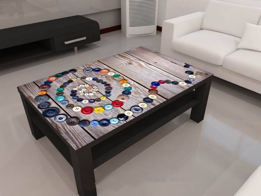 По периметру стола прикрутить бортики желаемой высоты. Заполнить пространство внутри бортиков различными декоративными элементами. Это может быть композиция из ракушек, пуговиц, монет и т.д.