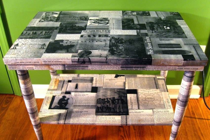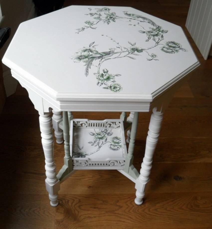 Техника «Декупаж». Для оформления стола в данном стиле используется белый фон, специальный клей, тонкие салфетки с орнаментами и узорами или специальная бумага для декупажа, а также лак, которым покрывается финальный слой. Бумага накладывается на тонкий слой клея и разравнивается, после высыхания необходимо покрыть поверхность лаком.