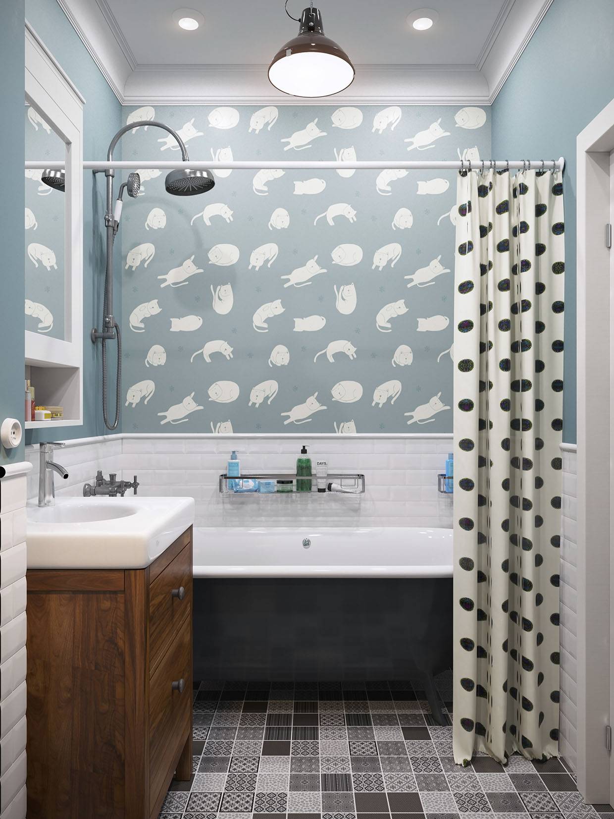 Если ванная 5-6 метров, то на стенах можно использовать 2 вида плитки. Но не делить стену горизонтально или вертикально, а использовать по принципу 1 плоскость — 1 плитка. В крайнем случае зонировать с привязкой к сантехнике и мебели или с какой-то идеей.