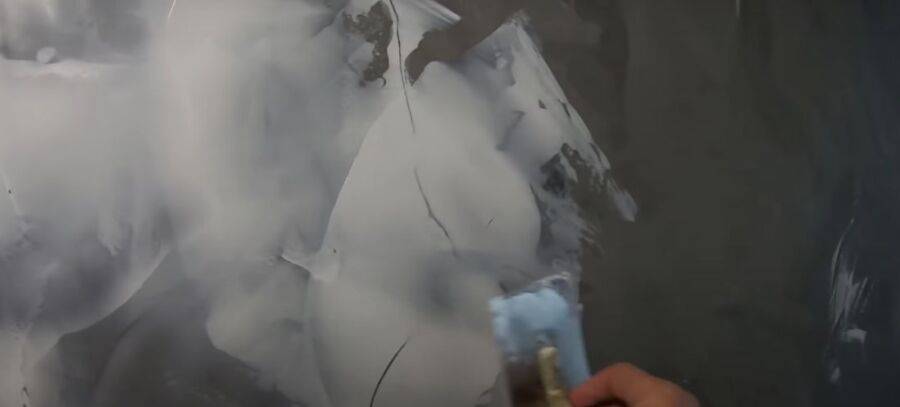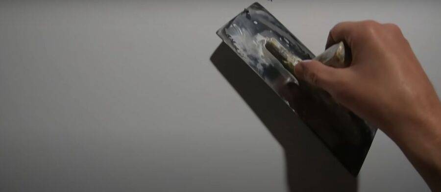 Все работы проводятся после частичного высыхания черновой отделки. Если черновой слой успел хорошо застыть, поверхность рекомендуется смочить водой. При помощи узкого шпателя на широкий инструмент наносится штукатурная смесь. Под углом не более 20 градусов большим шпателем распределяют раствор по поверхности стены. Движения при этом должны быть ровными и плавными.