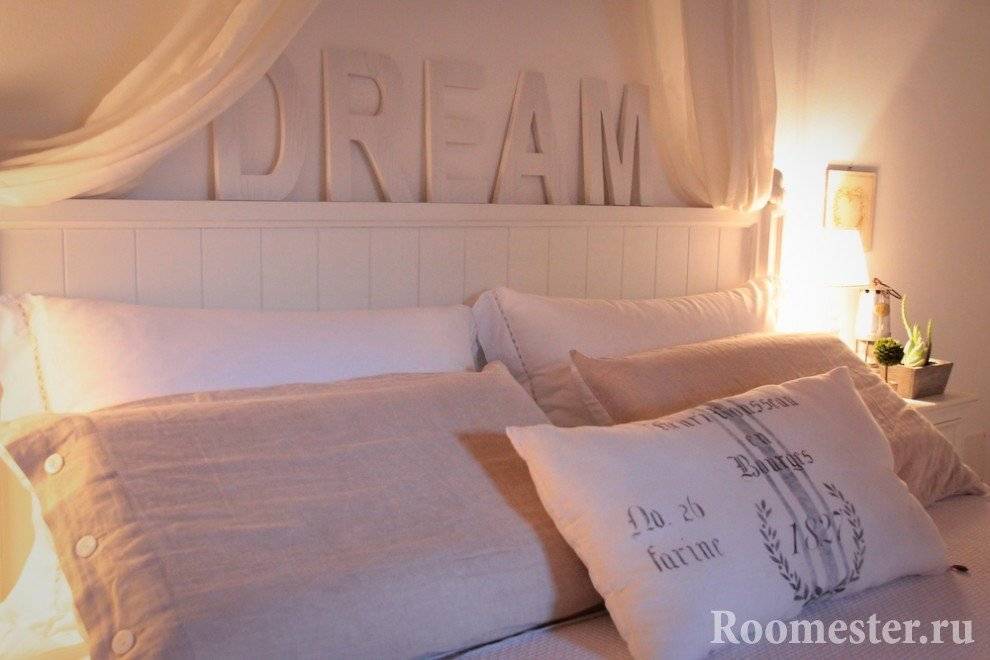 В спальне буквенный элемент создает домашний уют, заряжает позитивом. Здесь можно встретить не только слова на стену в интерьере, но и на потолок. Различные неоновые фразы, размещенные в области потолка, создадут необычную подсветку, которая будет выполнять декоративную функцию. У изголовья ложа будут красиво смотреться имена, ласковые слова, приятные выражения.