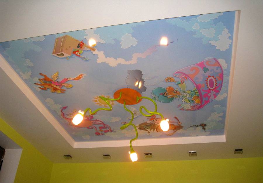 Потолок детской комнаты, может стать неотъемлемой частью красочного сюжета интерьера