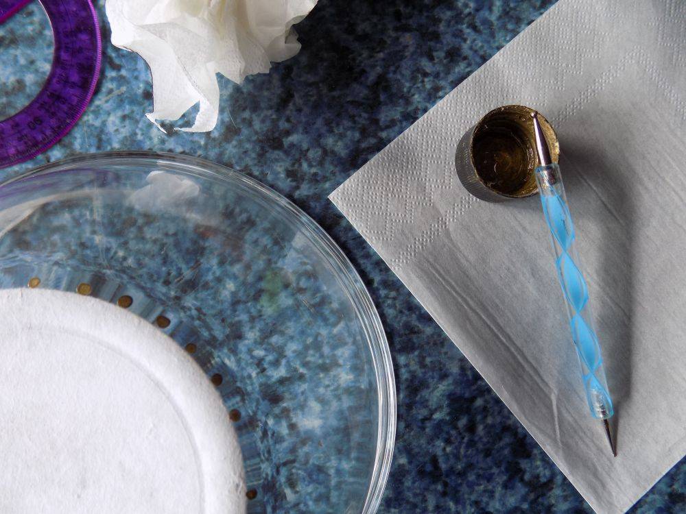 Обрабатываем внешнюю сторону тарелки спиртом. Окрашиваем края белой акриловой краской. После высыхания покрываем лаком для закрепления.