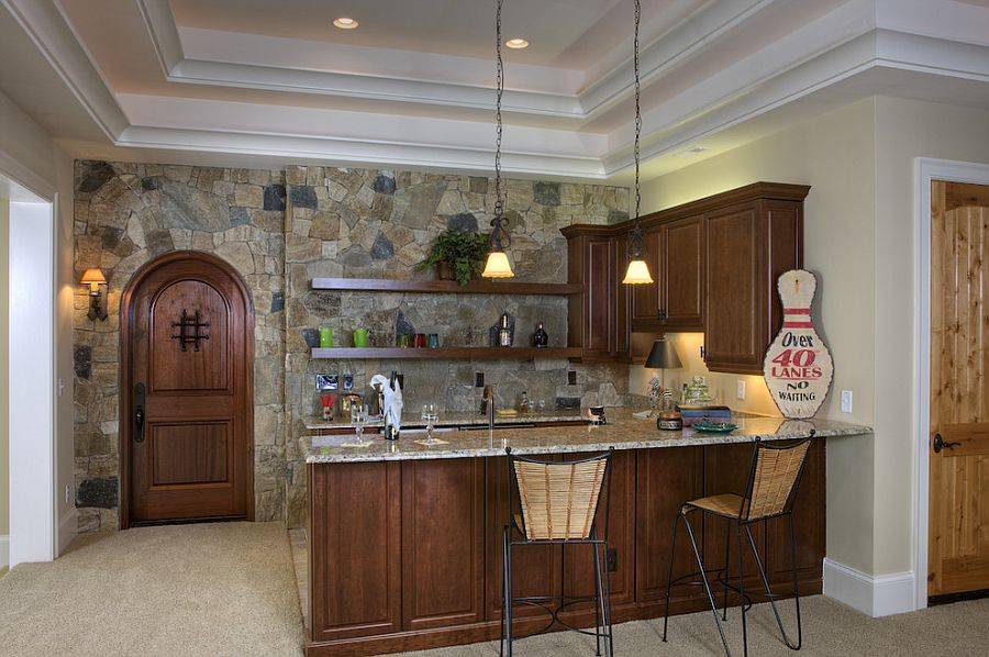 Во первых, сточки зрения дизайна, это сразу ее выделяет и делает очень красивой, а во вторых никаких следов от еды не остается. Камнем можно выделить зону барной стойки или украсить оконный проем. Очень интересно смотрятся эти зоны, если их подсветить одним или несколькими светильниками.