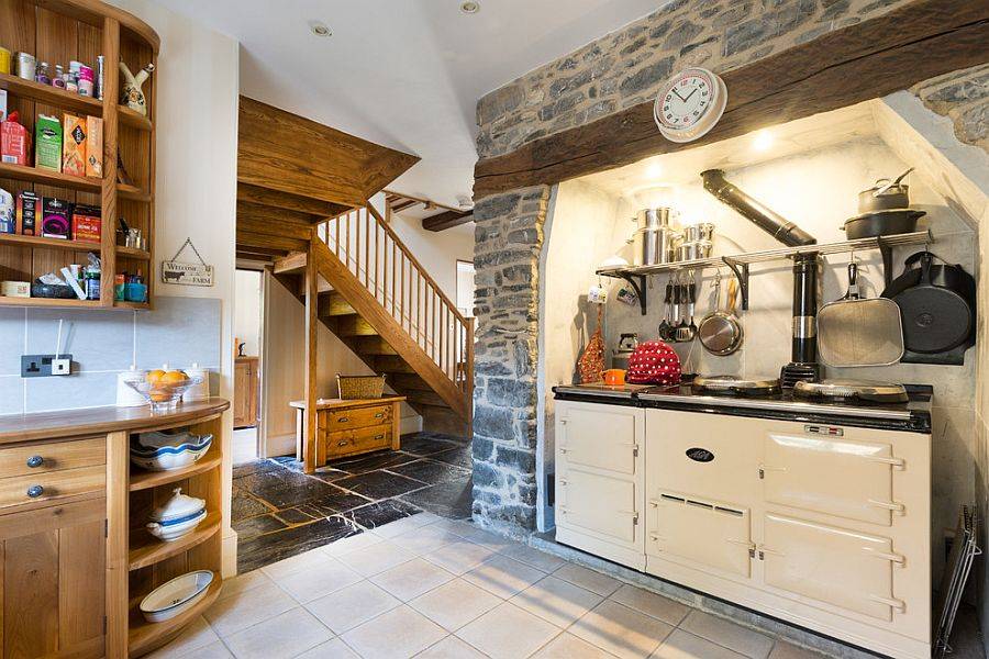 Можно обложить камнем в том случае, если кухня среднего и большого размера. Можно сделать из валуна смежные или параллельные стены в комбинации с деревом или штукатуркой.