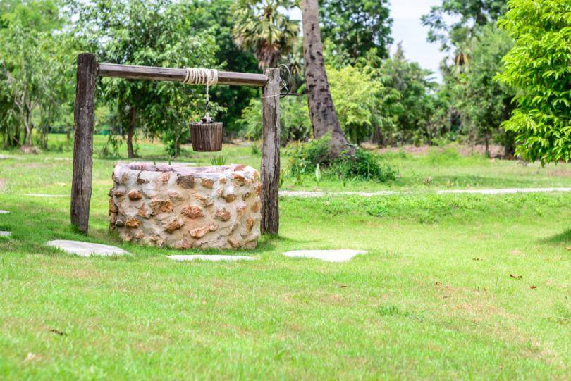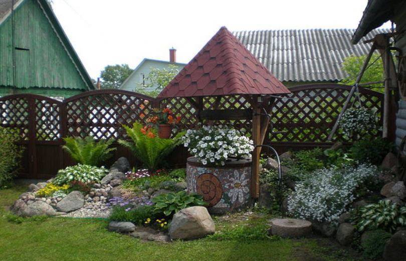 Важно оформить все максимально естественно и натурально. Хорошо смотрится декоративный колодец, вокруг которого посажена газонная трава, низкорослые кустарники, вьющиеся растения, как показано на фото.