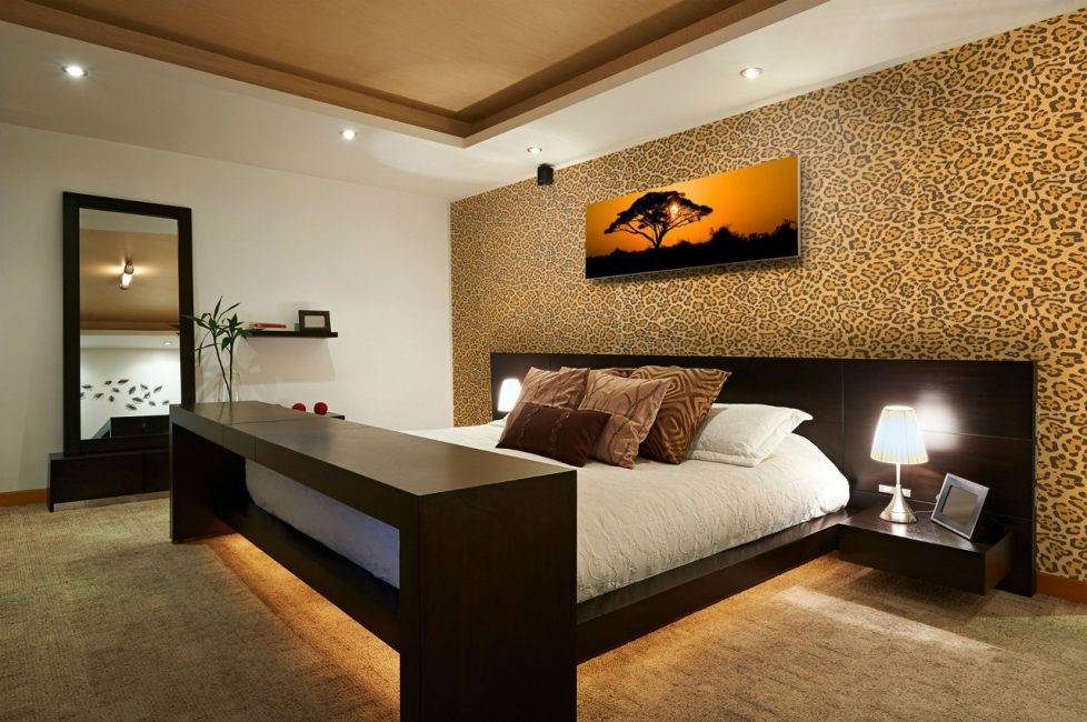 Если вы хотите как — то стилизовать «главную» стену – подберите фотообои с соответствующим общему интерьеру рисунком. Производители предлагают массу вариантов дизайна фотообоев. У себя дома вы можете оказаться на берегу океана, в горах или в райском саду с экзотическими растениями.