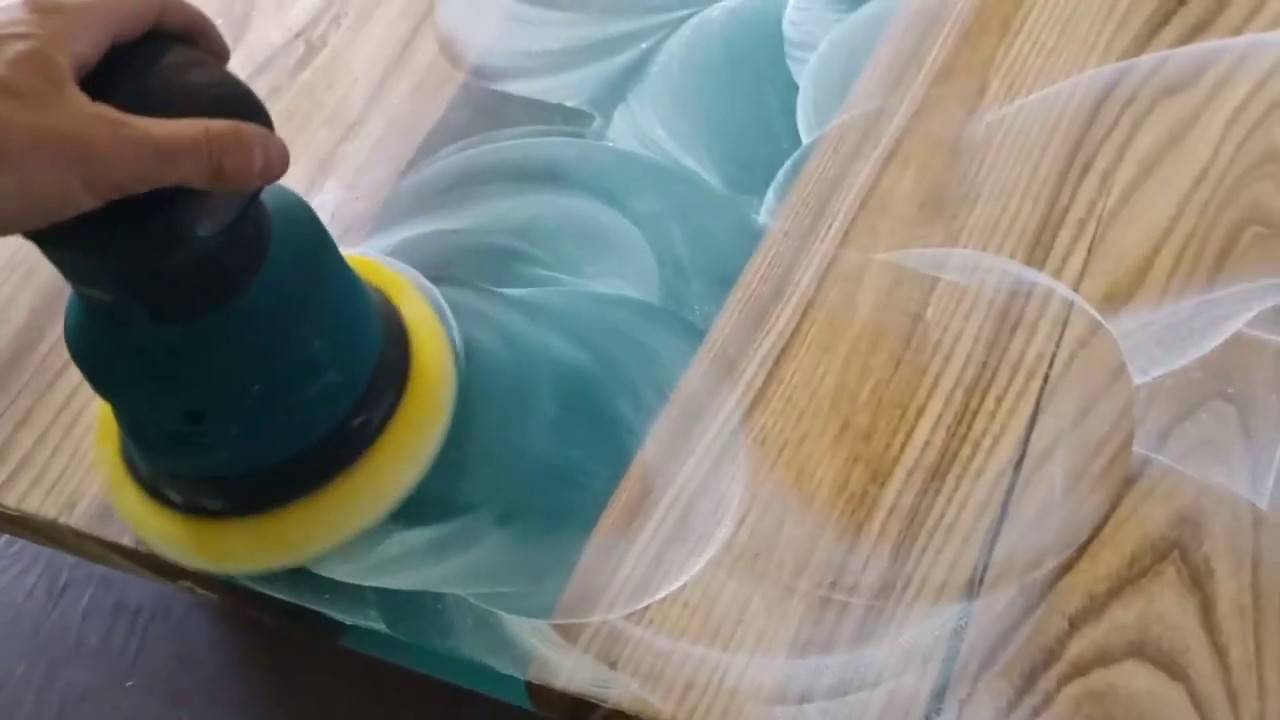 Полное отвердение столешницы после нанесения последнего слоя в условиях комнатной температуры завершается через 7 дней. Если нагреть помещение до +25 С, то время сократиться вдвое. Бортики после высыхания состава снимают. Столешницу обрабатывают шлифовальной машинкой, снимая верхний слой смолы. Когда будет полностью просматриваться весь рисунок, поверхность очищают от пыли, затем покрывают лаком. Края также надо отшлифовать.
