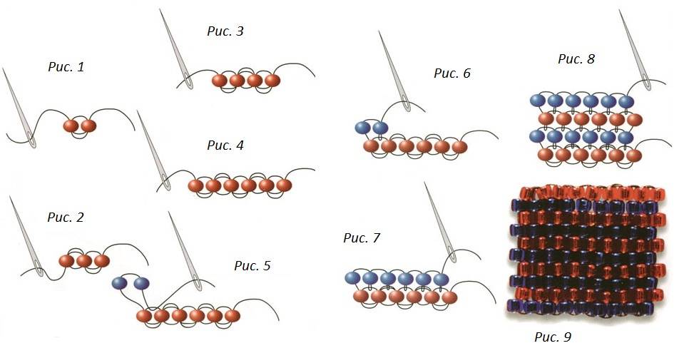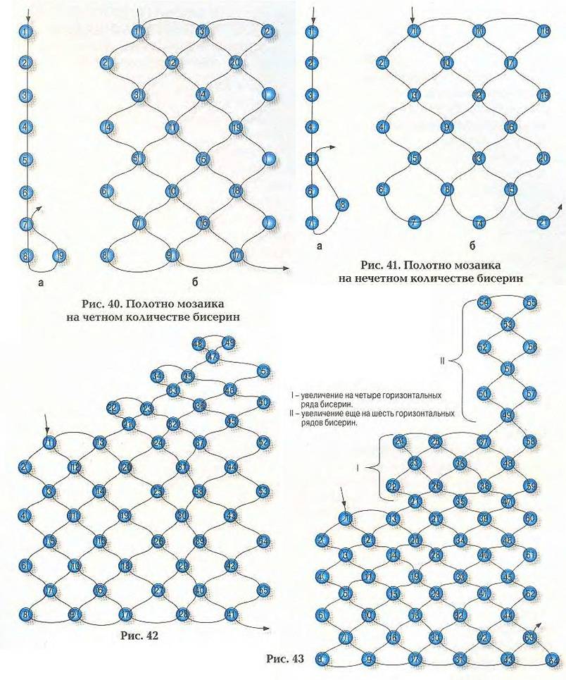 Для плетения четного набирается четное количество бусин, они составляют первый ряд полотна, для второго набираем одну бусину, а иглу пропускаем через вторую бусину от конца ряда, затем прошиваем бусину через четвертую от конца ряда и так далее. Заканчиваем ряд пропусканием иглы через первую нанизанную бусину. Для набора последующих рядов прошиваем бусину через последнюю, нанизанную в предыдущем ряду. Перед тем, как оборвем нить, пропускаем иглу зигзагом через все плетение.
