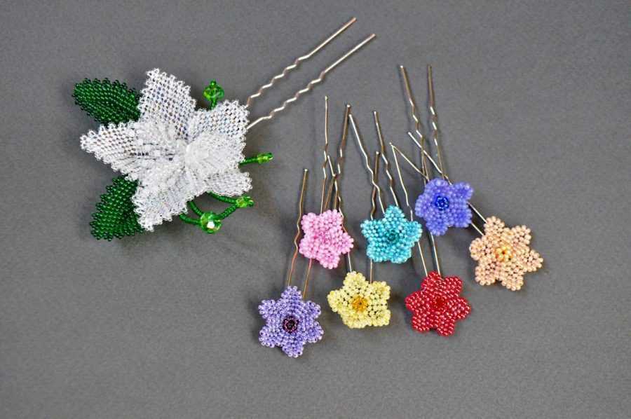 Украсить шпильку для волос плетенным цветком из бисера — хороший вариант для детских ручек.