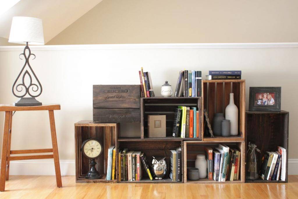 Из деревянных ящиков получатся отличные стеллажи. Они могут быть строгой прямоугольной формы или иметь асимметричные края, что придаст особый колорит обстановке комнаты. Идеальна подобная система хранения для домашней мастерской, рабочего кабинета или гостиной. Ящики закрепляют между собой с помощью саморезов или шурупов, окрашивают и приставляют к стене. Хранить на таких стеллажах можно все, что душе угодно: книги, вещи, украшения, продукты, полотенца и подушки, бытовую химию, мелкий декор. Оригинально смотрятся конструкции, на полках которых размещены «нужные» вещи, чередующиеся с цветочными горшками. Прямоугольные стеллажи могут собираться из одинаковых ящиков, которые расположены в строгом порядке или вертикально и горизонтально, но таким образом, чтобы образовывалась система хранения правильной формы.