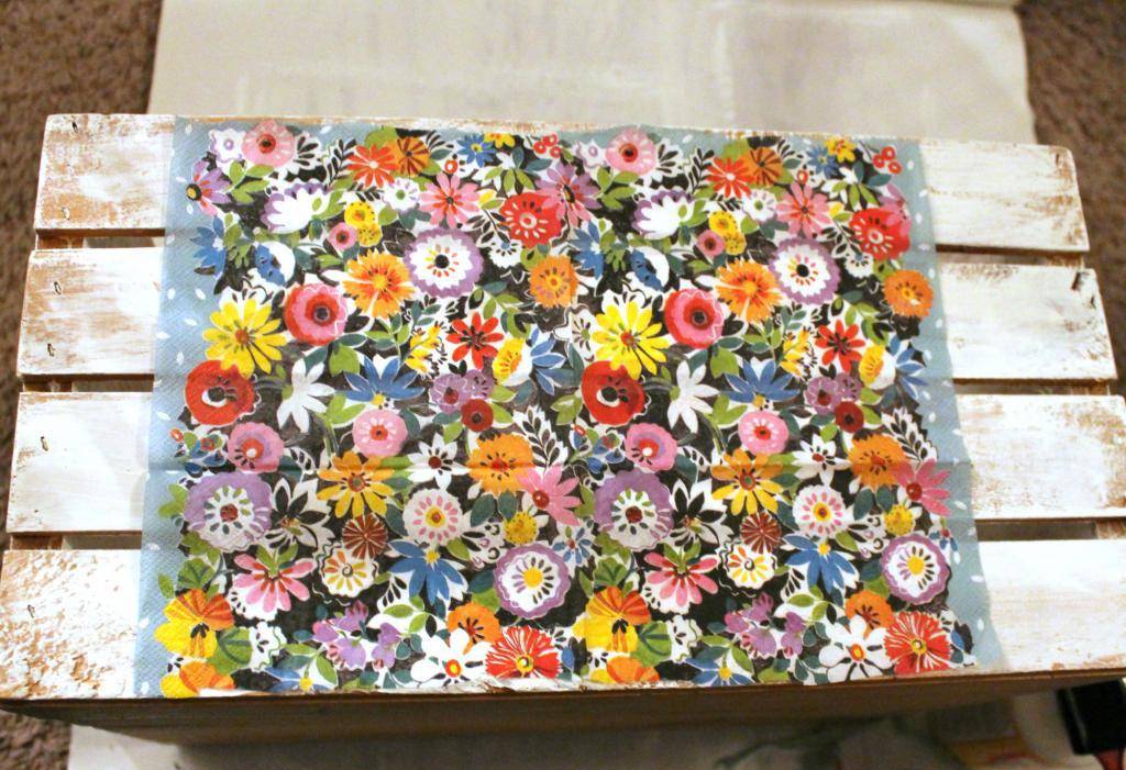 Следующий слой будет финишным. Возьмите подходящую по цвету краску и обработайте ею всю поверхность ящика. Слегка обработайте шкуркой сухую поверхность так, чтобы в некоторых местах появились темные просветы. Декупаж деревянного ящика для цветов лучше делать с использованием картинок, соответствующих тем растениям, которые будут помещены в данную емкость. Теперь можно приступать к фиксации рисунка и покрытию изделия лаком.