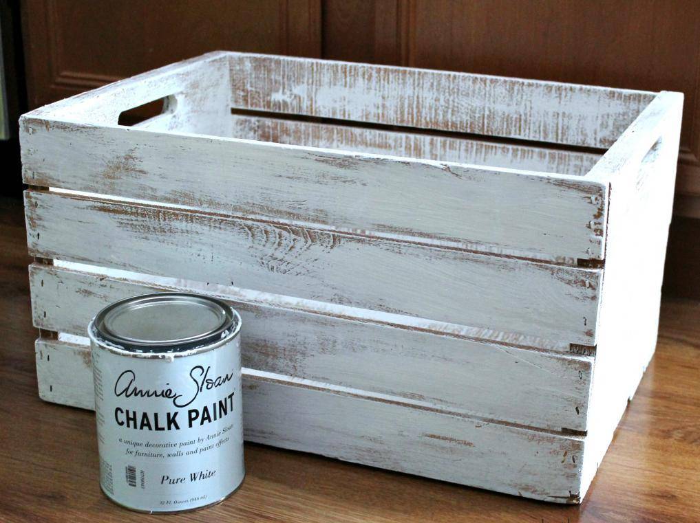 Поверхность ящика необходимо зашкурить и выровнять. После этого наносится слой белой краски. После высыхания краски снова обрабатываем поверхность наждачной бумагой. Для достижения эффекта состаривания используем краску темного цвета. Для этой цели идеально подойдет цвет жженой умбры. Не обязательно наносить его равномерно, основная часть этого слоя будет закрыта.