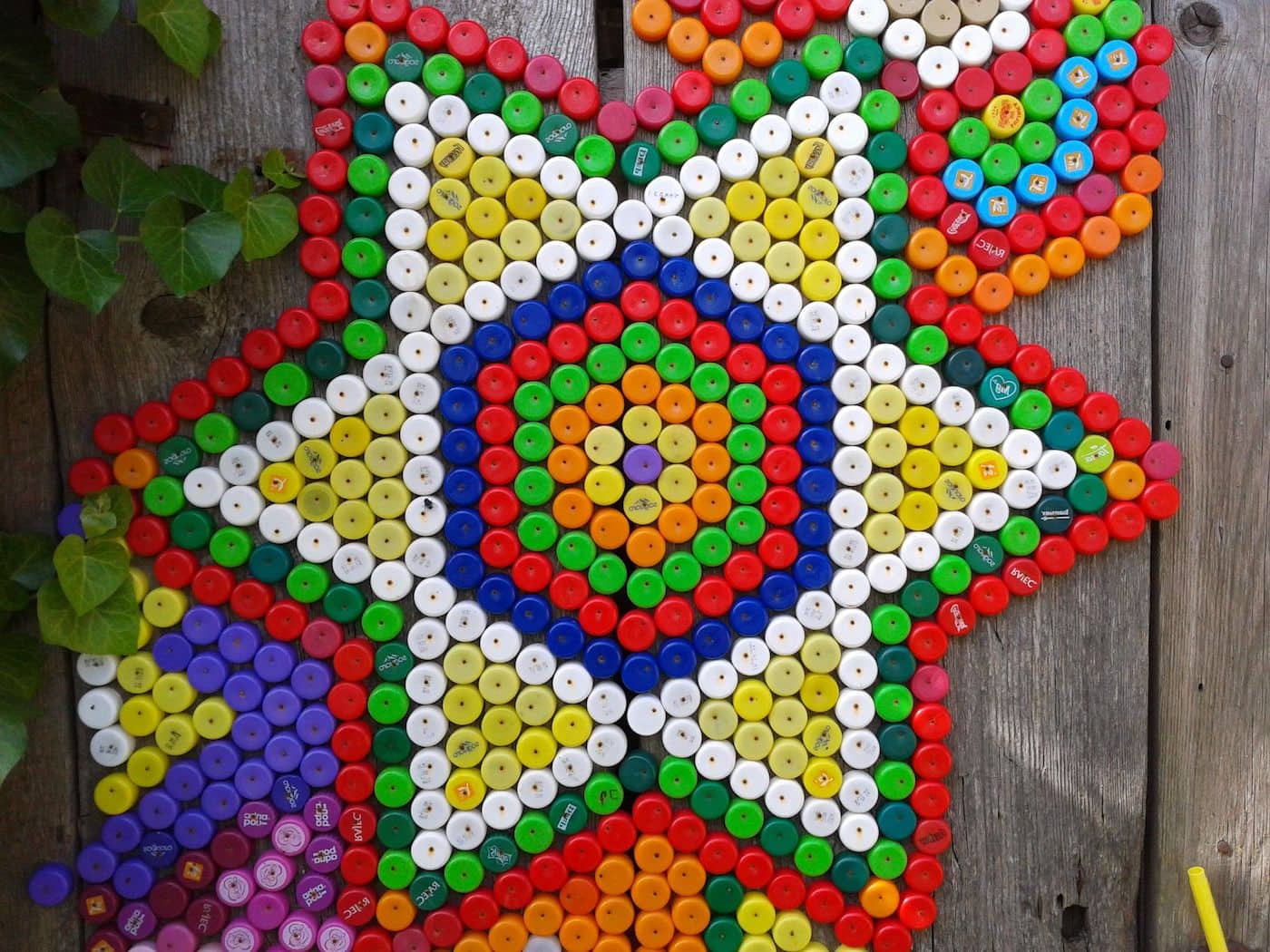 Гвозди, молоток, пробки от пластиковых бутылок потребуются для подобного настенного декора