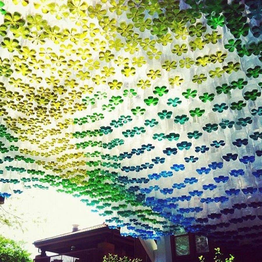 Умельцы из такого доступного материала, как пластиковые бутылки способны творить удивительные вещи, создавая, например, полноценную зону отдыха. Стены, занавески для летней беседки делают, как из этого материала, а также используют разноцветные крышки.